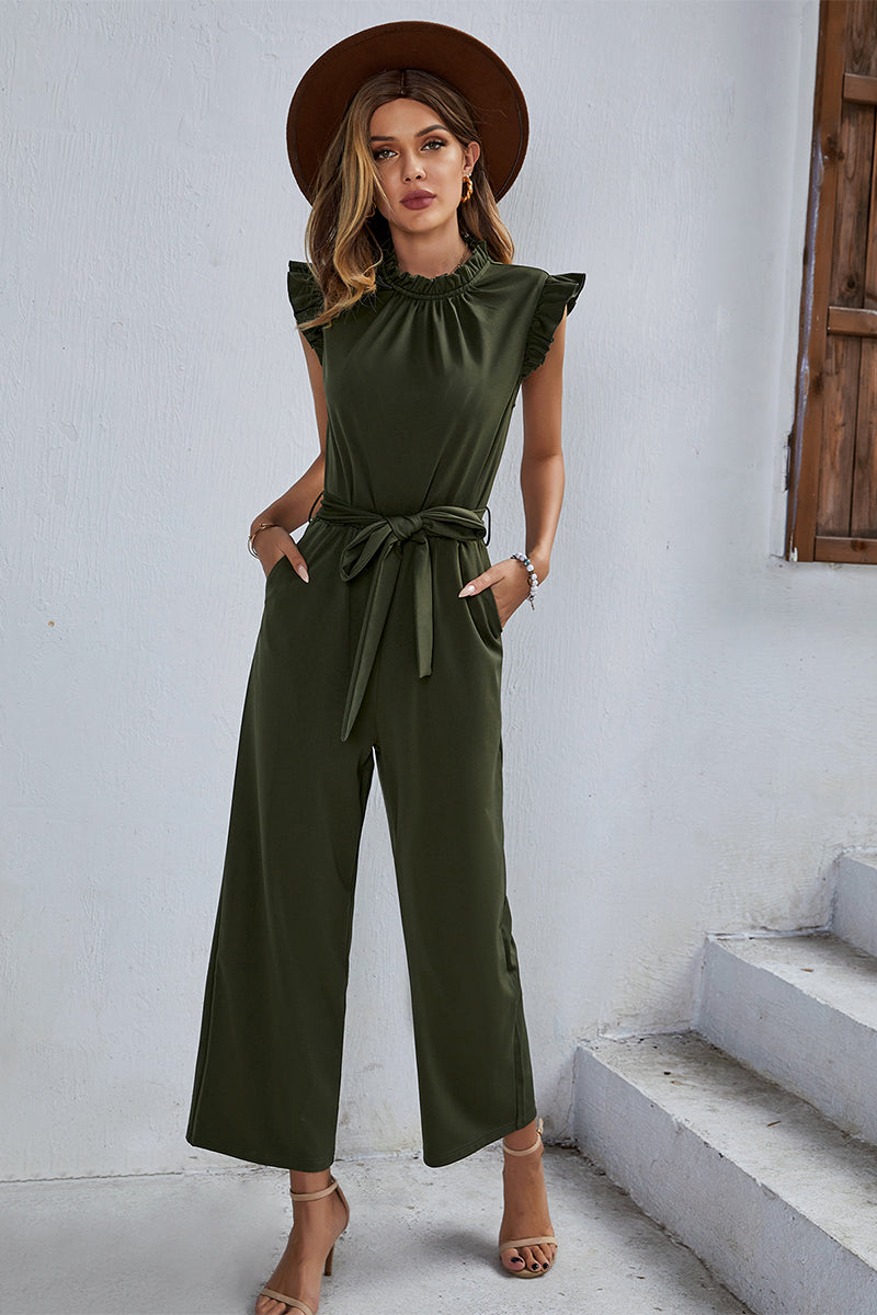 Our Ylika Jumpsuit comes in a_natural olive colour. Breaking out from the walls of your workroom, this_sleeveless_style pantsuit can take you from the office to a formal party with its_ruffle collar, ankle length hem and self tie fabric waist belt. Make the stares worthwhile by pairing this with_pair of our strappy heels and a mini leather bag with a pop of neon shade!